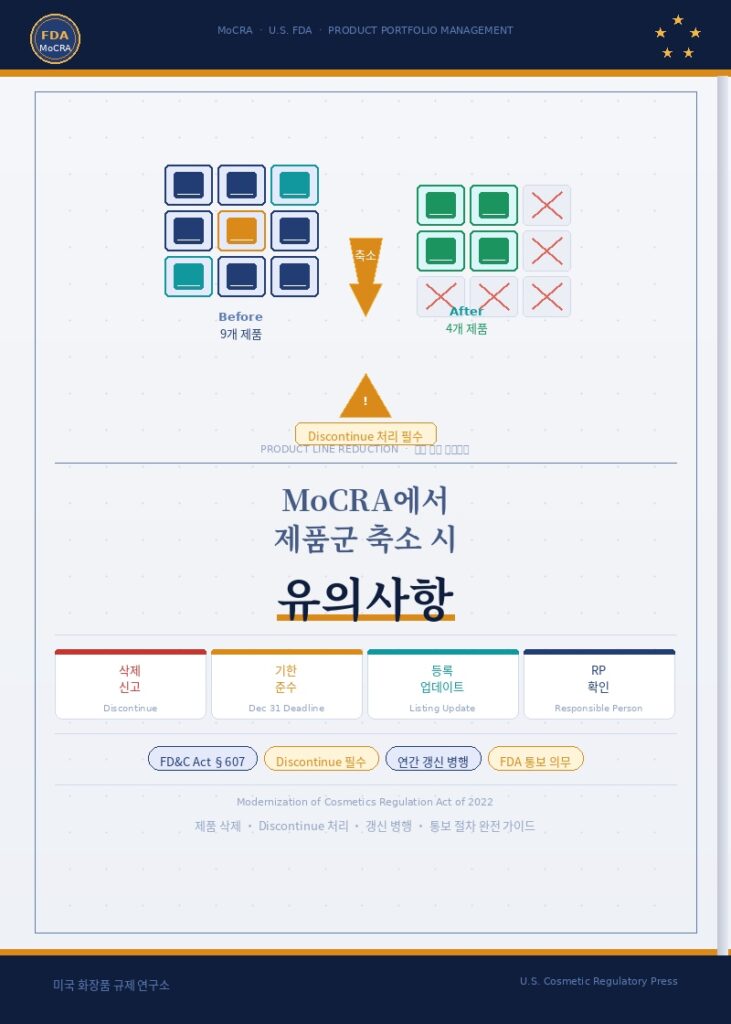 최근 미국 화장품 시장에서는 MoCRA(Modernization of Cosmetics Regulation Act) 시행으로 인해 제품 등록과 시설 등록에 대한 관리가 한층 강화되었습니다. 이에 따라 많은 브랜드와 제조사들이 제품 포트폴리오를 재정비하거나 일부 제품군을 축소하는 전략을 검토하고 있습니다. 그러나 MoCRA 환경에서는 단순히 제품을 판매하지 않는다고 해서 모든 관리 의무가 자동으로 사라지는 것은 아니기 때문에 몇 가지 중요한 사항을 신중하게 확인할 필요가 있습니다.