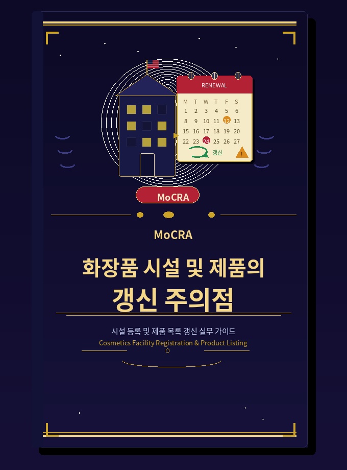 MoCRA 화장품 시설 및 제품의 갱신은 단순한 행정 절차가 아니라, 글로벌 시장에서 제품의 신뢰성과 규정 준수를 지속적으로 유지하기 위한 핵심 관리 요소입니다. 특히 미국의 Modernization of Cosmetics Regulation Act of 2022는 기존보다 훨씬 강화된 책임과 의무를 요구하고 있기 때문에, 시설 등록과 제품 리스팅의 갱신 과정에서 발생할 수 있는 리스크를 사전에 이해하고 대응하는 것이 중요합니다. 이러한 흐름은 유럽의 EU Cosmetics Regulation (EC) No 1223/2009과도 맥락을 같이하며, 두 시장 모두 ‘지속적인 적합성 유지’를 핵심 가치로 보고 있습니다.